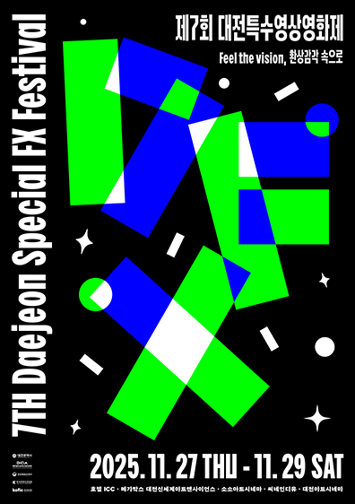 2025년 대전특수영상영화제(DFX) 포스터는 정적 그래픽을 기반으로 하면서도 영상 매체와의 확장성을 고려해 설계되었다. 크로마키(Chroma key) 컬러 영역은 단순한 색면이 아니라, 영상 매체 적용 시 키값(Key value)을 부여해 다양한 영상이나 모션을 결합할 수 있는 창으로 작동한다. 이에 따라 포스터는 인쇄물에서는 강렬한 색 대비의 그래픽, 디지털 화면에서는 이동과 공간감을 지닌 동적 키비주얼로 변환된다.디지털 화면 적용 시 크로마키 영역은 모션을 통해 확장되며, 모션의 교차가 평면과 입체를 동시에 작동시켜 특수영상적(SFX) 감각을 구현한다. 이를 통해 정적인 포스터 안에서도 영상적 질감과 빛의 분산이 살아나는 경험을 제공하며, “환상 감각 속으로”라는 슬로건을 시각적으로 실현한다.